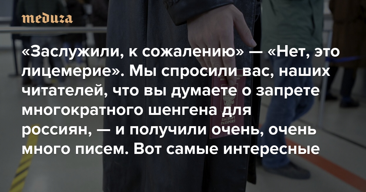 «Заслужили, к сожалению» — «Нет, это лицемерие» Мы спросили вас, наших читателей, что вы думаете о запрете многократного шенгена для россиян, — и получили очень, очень много писем. Вот самые интересные
