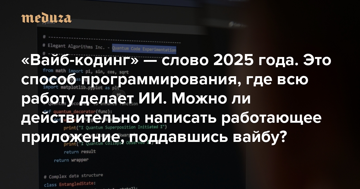 Составители толкового словаря английского языка Collins English Dictionary назвали «вайб-кодинг» словом 2025 года. Под этим термином подразумевается процесс программирования, при котором пользователь, «поддавшись вайбу», просто описывает словами приложение, которое хочет получить. А всю основную работу за него выполняет искусственный интеллект. Несмотря на то, что термин существует 10 месяцев, а само явление — и того дольше, каких-то ярких примеров использования вайб-кодинга в профессиональной разработке до сих пор крайне мало. «Медуза» рассказывает, чем привлекателен такой метод программирования, и есть ли у него будущее.