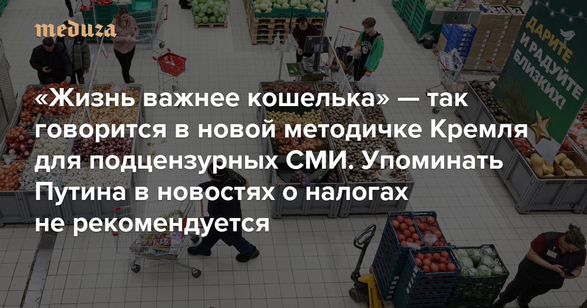 Россияне должны быть благодарны за то, что им подняли налоги «Жизнь важнее кошелька» — так говорится в новой методичке Кремля для подцензурных СМИ. Упоминать Путина в новостях о налогах не рекомендуется