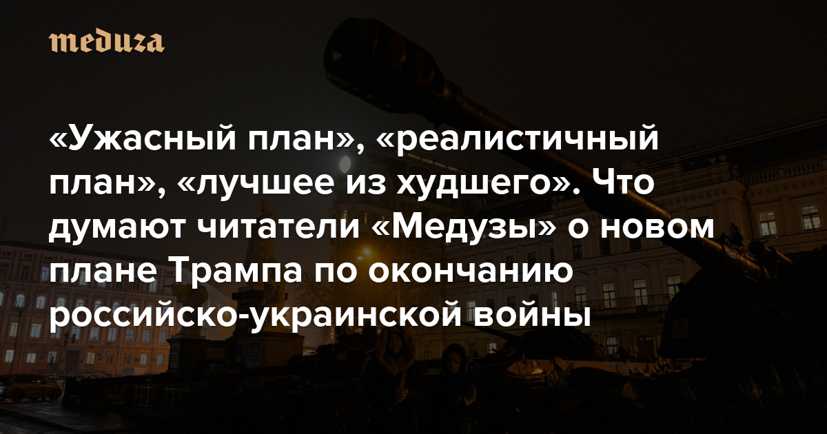 22 ноября в СМИ появился план администрации Дональда Трампа по завершению войны между Россией и Украиной, который предполагает, в частности, признание де-факто контроля России над Донбассом, раздел Херсонской и Запорожской областей по линии фронта, отказ Украины от вступления в НАТО и ограничение численности ВСУ, а также использование замороженных российских активов для восстановления Украины (с выплатой «прибыли» США). Владимир Зеленский заявил о готовности работать над соглашением; Владимир Путин назвал предложение доработанной версией документа, который он обсуждал с Трампом на Аляске. По имеющимся данным, США настаивают, чтобы Украина и Европа согласились на эти условия в течение нескольких дней. Мнения экспертов и политиков по поводу этого плана разнятся. Несколько дней назад мы попросили вас — наших читателей — поделиться своим мнением. Вот некоторые из ваших ответов.