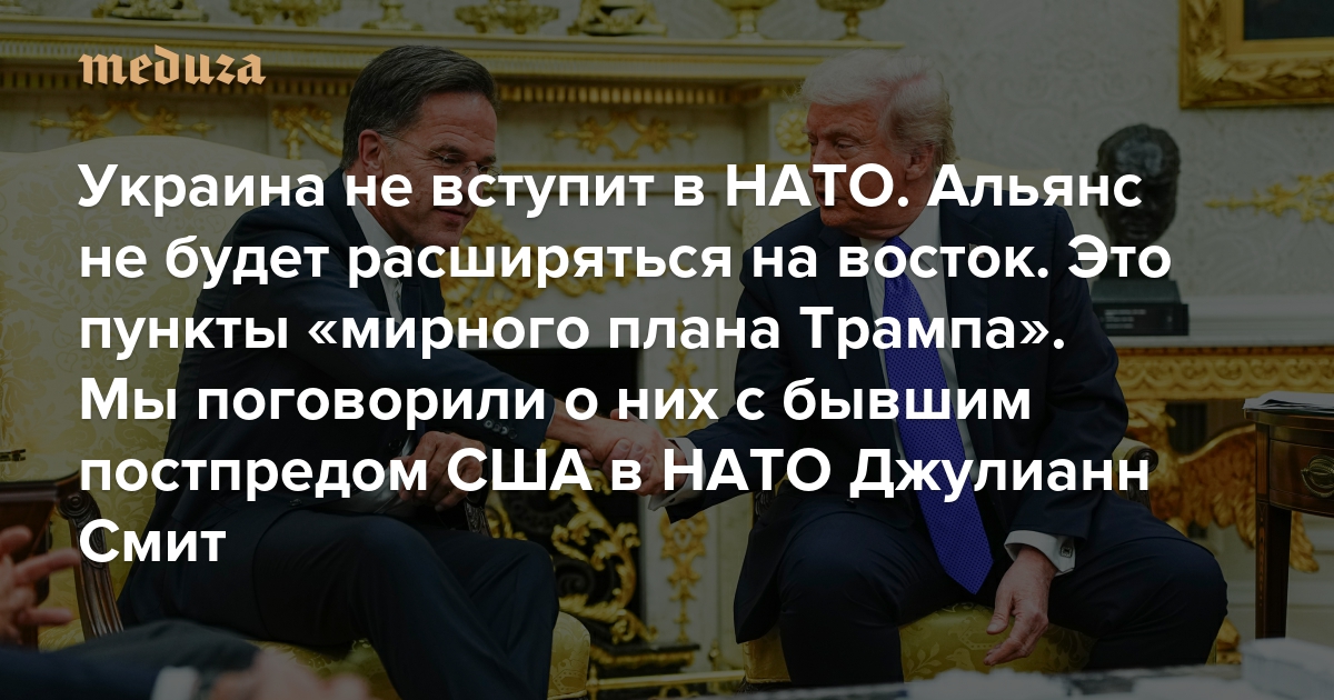 Украина не вступит в НАТО. Альянс не будет расширяться на восток Это пункты «мирного плана Трампа». Мы поговорили о них с бывшим постпредом США в НАТО Джулианн Смит