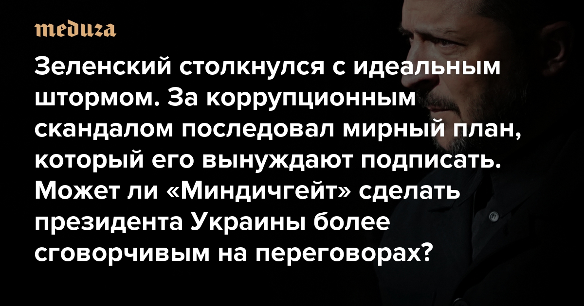 Почему «Миндичгейт» обернулся для Зеленского идеальным штормом? Как президент Украины реагирует на него за закрытыми дверями? И как эта история может влиять на позицию Зеленского при обсуждении условий окончания войны? «Медуза» изучила ключевые материалы (раз, два и три), авторы которых пытаются найти ответы на эти вопросы.