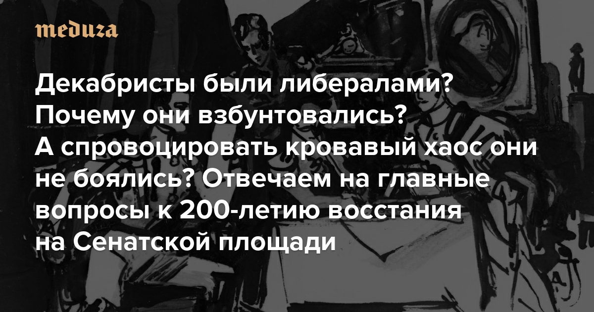 С момента одного из знаковых событий российской истории — восстания декабристов на Сенатской площади в Санкт-Петербурге — прошло 200 лет. За два века эта неудавшаяся попытка государственного переворота словно бы прошла полный цикл своих трактовок: в Российской империи непосредственных участников восстания репрессировали, при советском строе их превратили в героев революционной борьбы, а нынешние путинские чиновники призывают «объективно» оценивать события декабря 1825-го. Скрывается за этими призывами, конечно же, плохо маскируемое желание провести параллели между дворянами-бунтовщиками XIX века и современными «врагами государства» из числа «иноагентов» и прочих оппонентов режима. Уйти от громоздкой политической надстройки невозможно — и все же мы решили попытаться ответить на самые очевидные вопросы о декабристах объективно (уже безо всяких кавычек). Когда их стали так называть? Чего они добивались? Могли ли свергнуть царя? И осознавали ли риск кровавого исхода своего выступления?