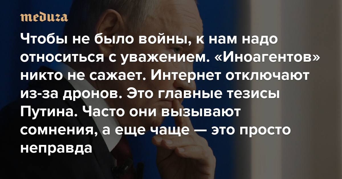 Чтобы не было войны, к нам надо относиться с уважением. «Иноагентов» никто не сажает. Интернет отключают из-за дронов Это главные тезисы из четырехчасового выступления Путина. Часто они вызывают сомнения, а еще чаще — это просто неправда
