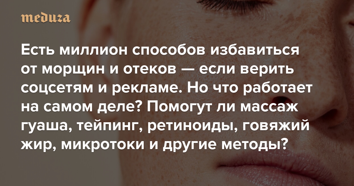 Антивозрастные сыворотки и кремы, разные виды массажа лица, микротоки и коллаген в добавках предназначены для того, чтобы вернуть коже упругость, убрать отеки и уменьшить глубину морщин. Выбор огромный, но точно ли все это работает? Кооператив независимых журналистов «Берег» собрал научные данные по всем популярным методам, поговорил с косметологом и сделал большой обзорный материал. «Медуза» публикует его полностью.