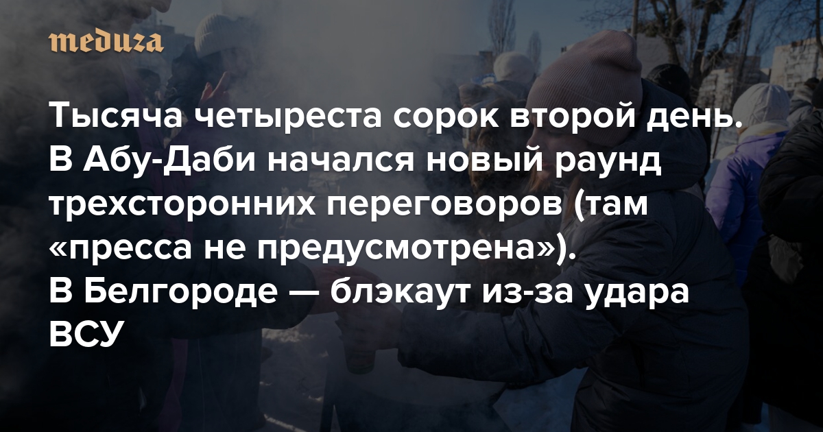 Война Тысяча четыреста сорок второй день. В Абу-Даби начался новый раунд трехсторонних переговоров (там «пресса не предусмотрена»). В Белгороде — блэкаут из-за удара ВСУ