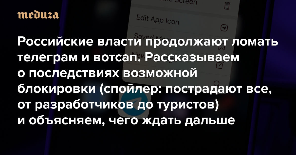 Российские власти продолжают ломать телеграм и вотсап Рассказываем о последствиях возможной блокировки (спойлер: пострадают все, от разработчиков до туристов) и объясняем, чего ждать дальше