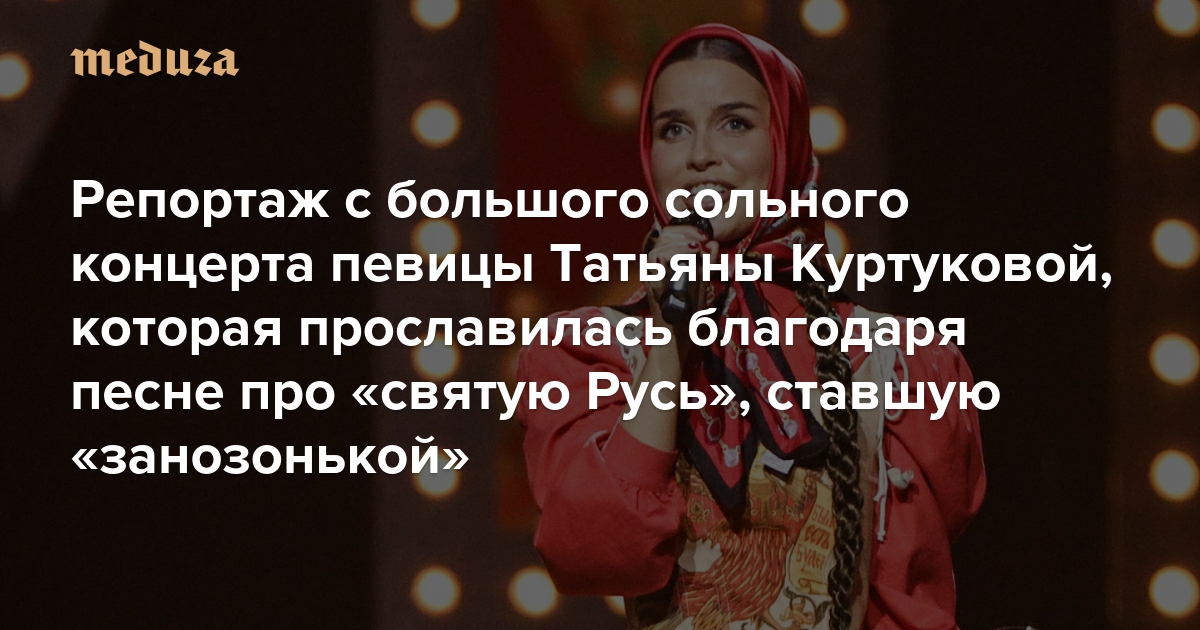 Больше трех тысяч человек пришли на первый крупный сольный концерт Татьяны Куртуковой — 32-летней российской певицы, которая стала знаменитой благодаря патриотическим песням в русской народной обработке. Это не первое выступление артистки, ранее она уже выходила на большую сцену, но никогда не готовила полноценную шоу-программу. Корреспондент кооператива независимых журналистов «Берег» 21 февраля побывал на московском концерте народной исполнительницы, которая никогда не высказывалась о российско-украинской войне, но недвусмысленно показала свою позицию в концертной программе. «Медуза» публикует этот репортаж целиком.