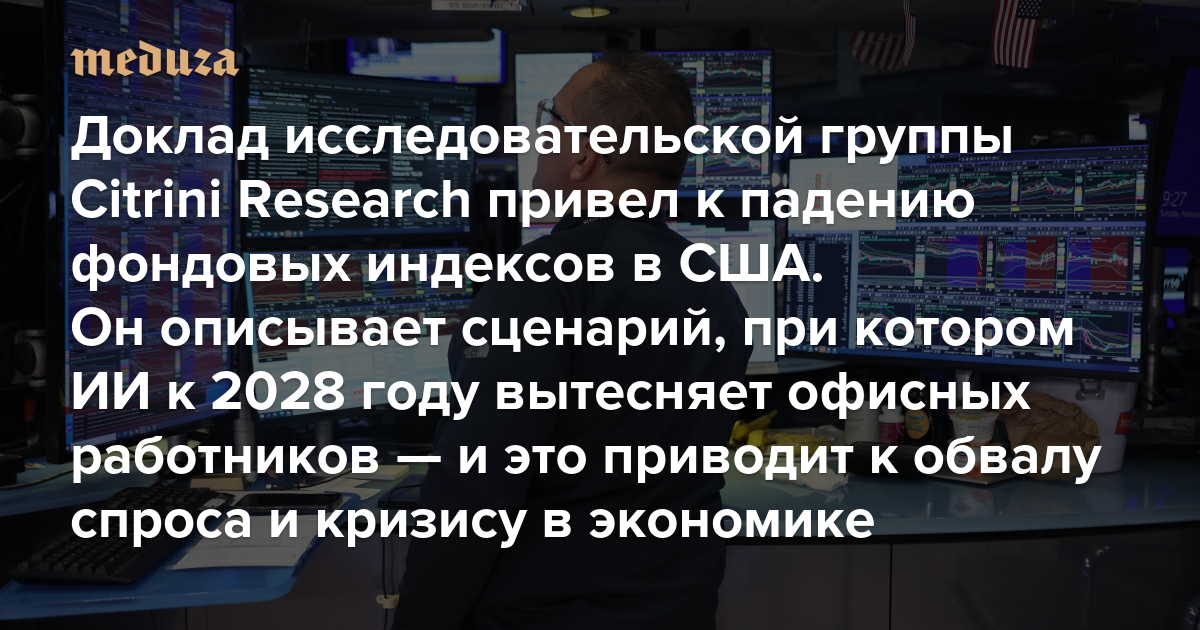 Доклад исследовательской группы Citrini Research привел к падению фондовых индексов в США Он описывает сценарий, при котором ИИ к 2028 году вытесняет офисных работников — и это приводит к обвалу спроса и кризису в экономике