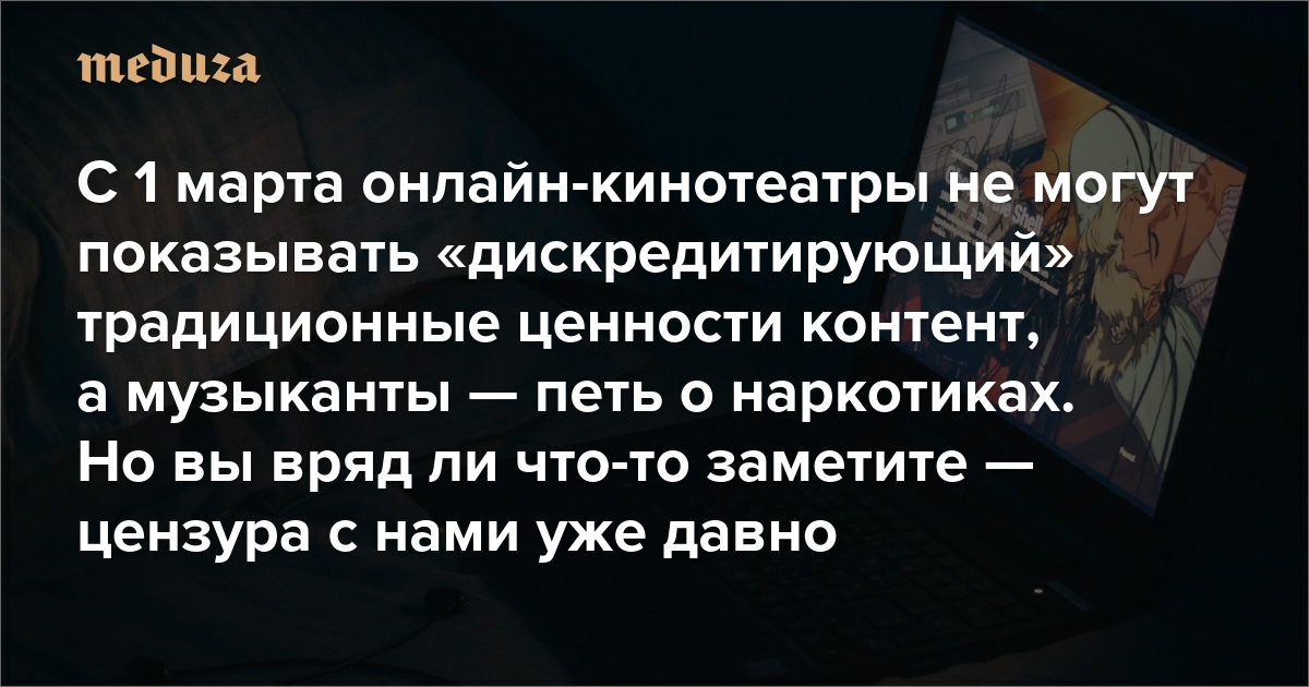 С 1 марта онлайн-кинотеатры не могут показывать «дискредитирующий» традиционные ценности контент, а музыканты — петь о наркотиках Но вы вряд ли что-то заметите — цензура с нами уже давно