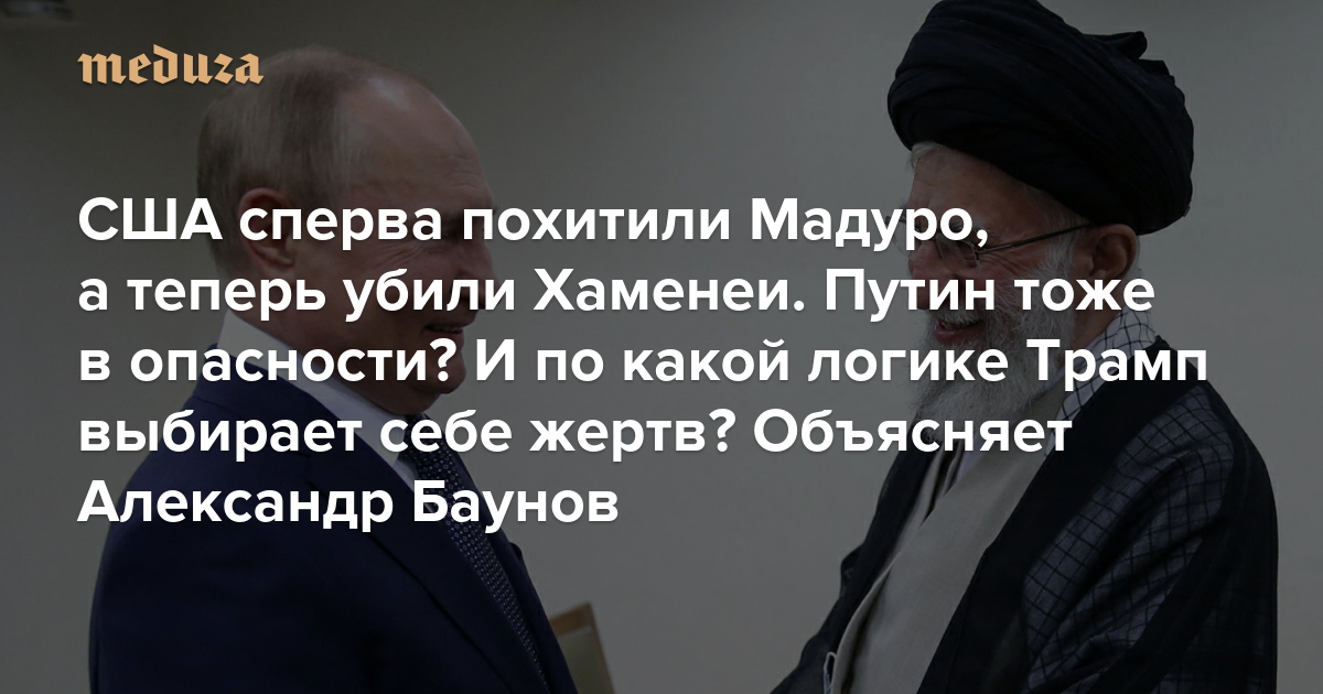 Сперва Мадуро, теперь Хаменеи — кто дальше? Дональд Трамп продолжает насильственным путем устранять лидеров стран, которые ему неугодны. Более того: все они были диктаторами и все активно придерживались антизападной риторики, противопоставляя свои режимы гегемонии США. Примерно этим же порой занимается Владимир Путин. Находится ли теперь он в опасности? И что новая война на Ближнем Востоке означает для России, которая вообще-то давний союзник Ирана? На эти вопросы отвечает старший научный сотрудник Берлинского центра Карнеги по изучению России и Евразии Александр Баунов.