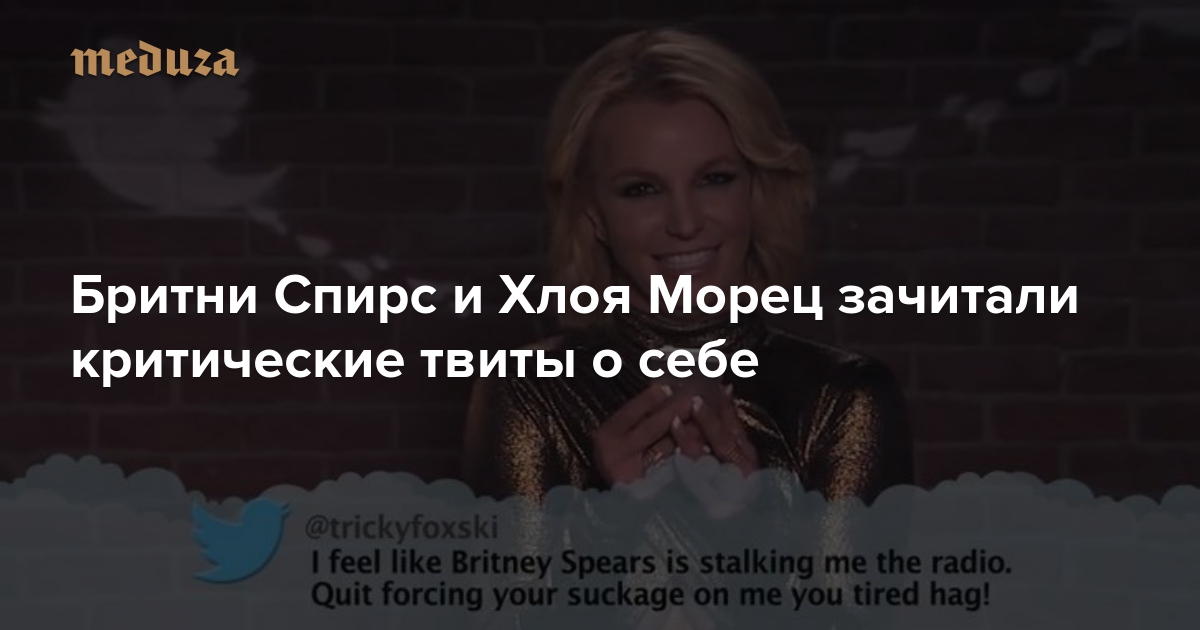 Американское телешоу Jimmy Kimmel Live Джимми Киммела периодически приглашает звезд зачитать на камеру негативные (а зачастую и нецензурные) твиты о себе. В очередном выпуске — певица Бритни Спирс, актеры Крис Прэтт, Джерард Батлер, Хлоя Морец, Гвинет Пэлтроу и другие популярные личности.