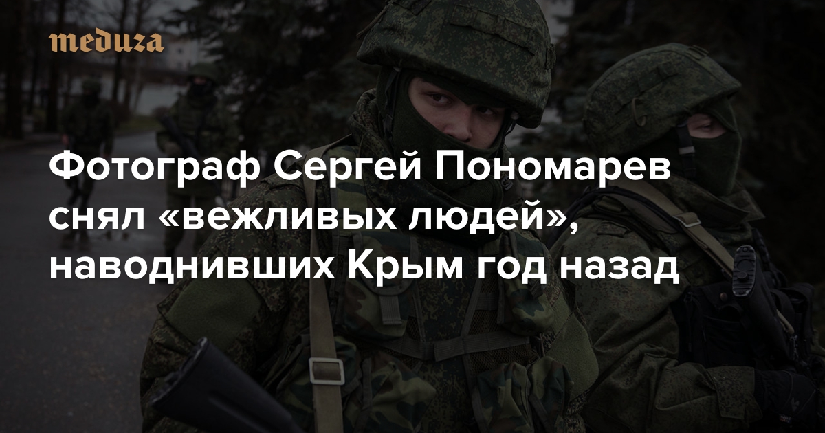 Сергей Пономарев — один из немногих российских фотографов, работавших в Крыму с конца февраля до середины марта 2014 года, то есть в дни, когда решалась судьба полуострова. Пономарев объехал основные города Крыма и везде снимал «зеленых человечков» — в масках, вооруженных по последнему слову техники. Его работа дает представление о том, как выглядели «вежливые люди» и даже о том, как они себя вели.