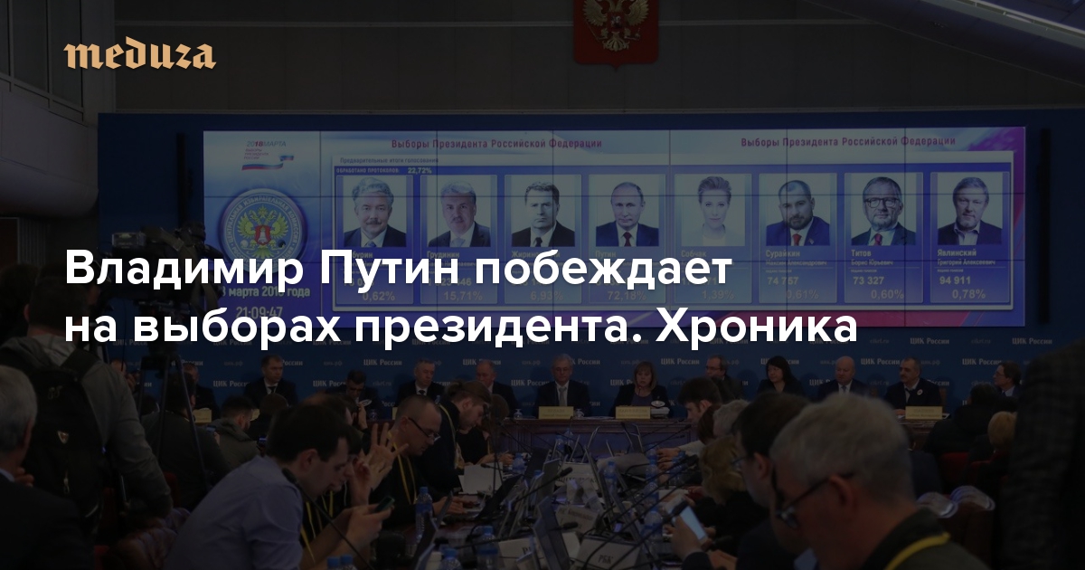 - На выборах побеждает Владимир Путин (74,55%), второе место — Павел Грудинин (13,77%)