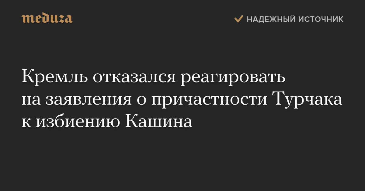 Пресс-секретарь президента РФ Дмитрий Песков заявил, что Кремль никак не будет реагировать на информацию о возможной причастности губернатора Псковской области Андрея Турчака к нападению на журналиста Олега Кашина. Таким образом Песков прокомментировал интервью жены обвиняемого по этому делу Данилы Веселова «Коммерсанту». Елена Веселова рассказала газете о существовании аудиозаписи, на которой Турчак говорит, что Кашина нужно избить.