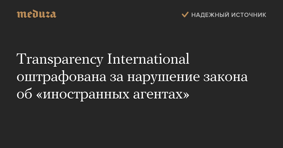 Российское отделение правозащитной организации Transparency International оштрафовано за нарушение закона об НКО-«иностранных агентах».