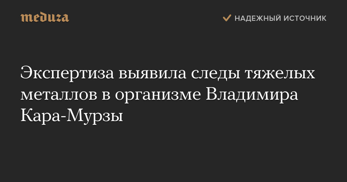 В организме координатора «Открытой России» Владимира Кара-Мурзы выявили повышенную концентрацию тяжелых металлов. Об этом сообщает РБК со ссылкой на заключение французского эксперта Паскаля Кинца. Образцы для экспертизы были взяты 29 мая 2015 года — через три дня после того, как состояние Кара-Мурзы резко ухудшилось.
