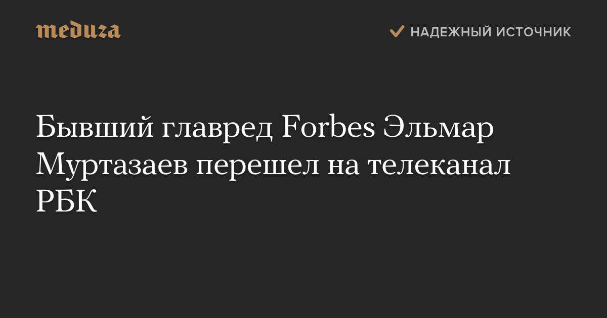 Бывший главный редактор российского издания Forbes Эльмар Муртазаев стал генеральным продюсером телеканала РБК. Он начнет работать в новой должности 1 апреля. В сообщении РБК говорится, что Муртазаев будет развивать форматы вещания и продвижения видеоконтента на телевидении и в интернете.
