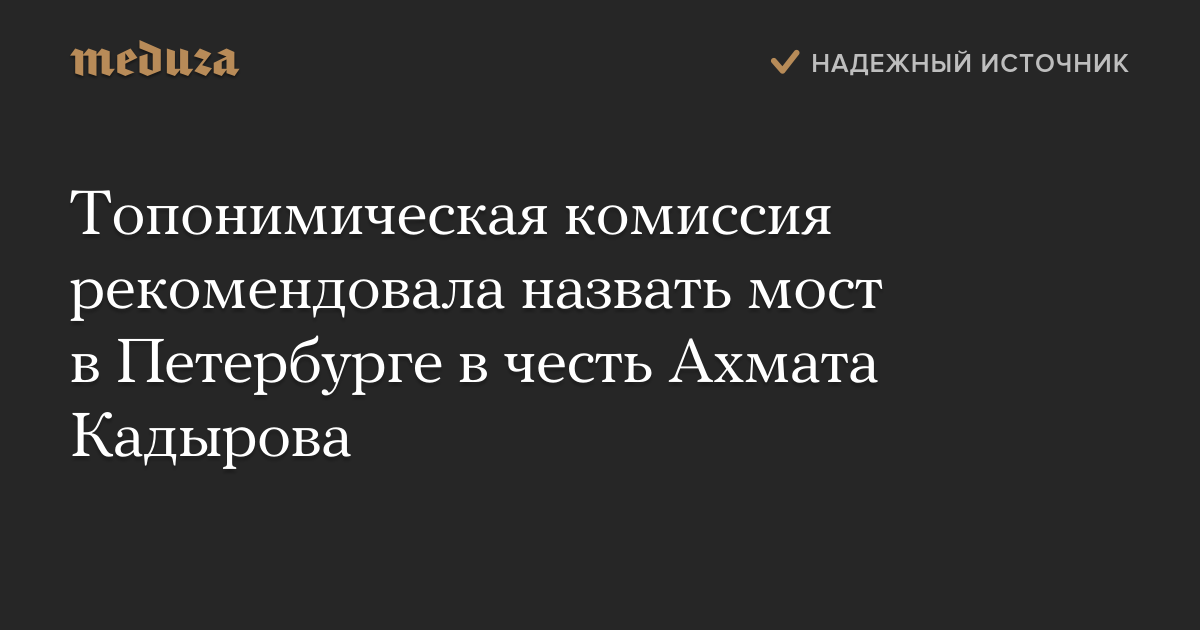 Топонимическая комиссия Санкт-Петербурга рекомендовала губернатору Георгию Полтавченко назвать безымянный мост через Дудергофский канал в честь первого президента Чечни Ахмата Кадырова.