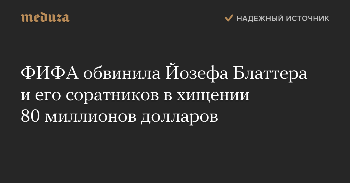 ФИФА обвинила бывшего президента федерации Йозефа Блаттера и его соратников в хищении 80 миллионов долларов в течение пяти лет.