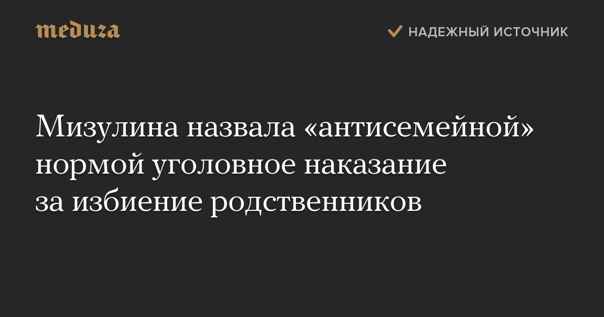 Замглавы комитета Совета Федерации по конституционному законодательству Елена Мизулина заявила, что принятые Госдумой поправки в Уголовный кодекс, предусматривающие уголовное наказание за нанесение побоев родственникам, являются «дискриминационными по отношению к членам семьи» и не соответствуют Конституции РФ. Мизулина назвала эти поправки «антисемейным» положением.