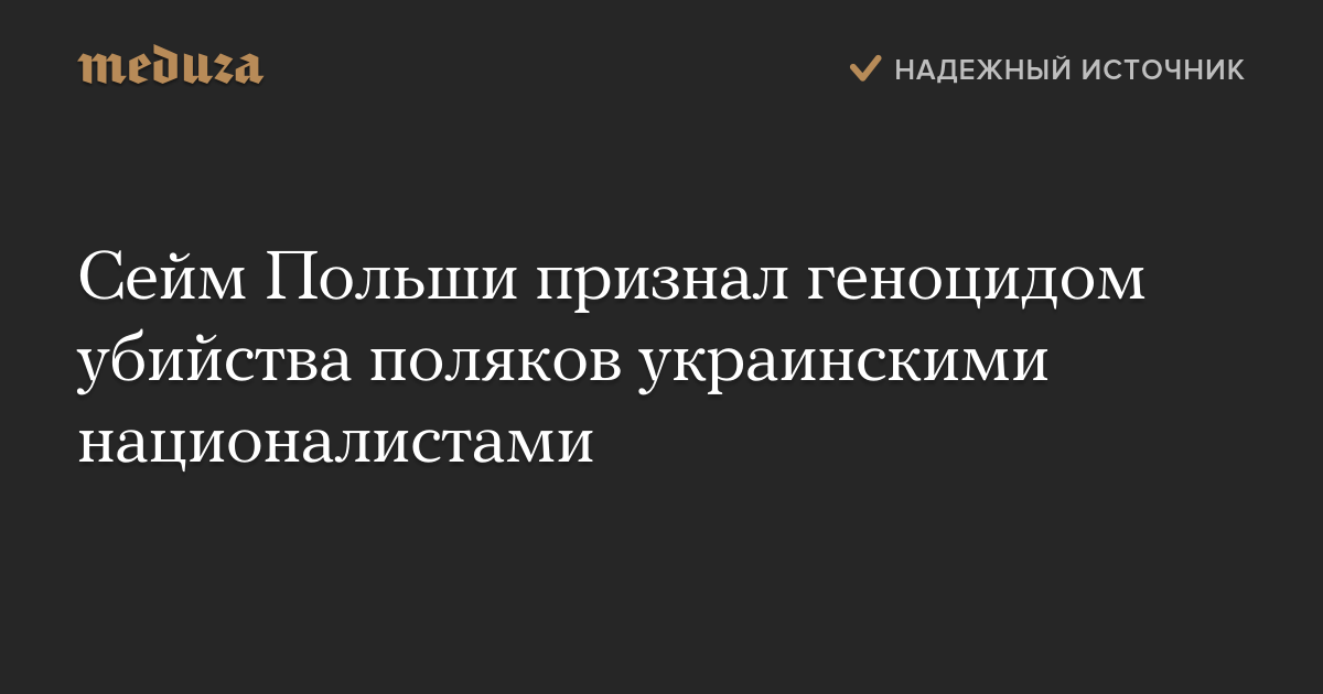 Сейм Польши принял резолюцию о признании геноцидом массового убийства поляков украинскими националистами в 1943 году. В поддержку такого решения проголосовали 432 депутата, 10 человек воздержались, против не высказался никто.