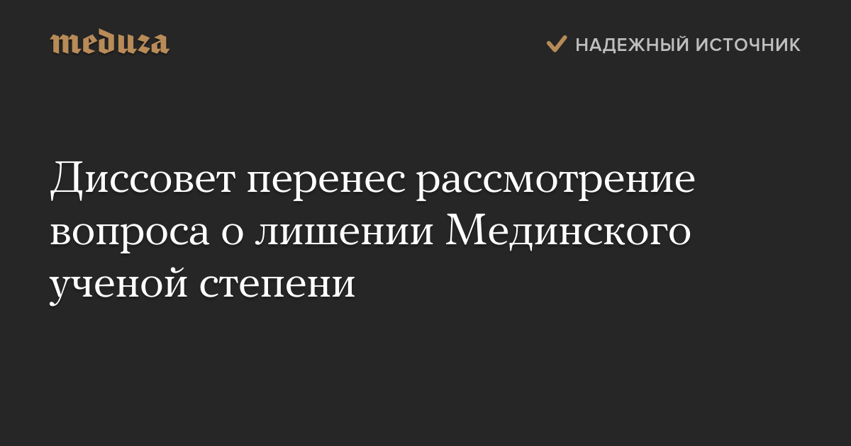Заседание перенесли по просьбе Мединского. Он сообщил диссовету, что не может приехать на заседание 4 октября из-за командировки в Казахстан. Просьбу министра поддержала Высшая аттестационная комиссия.