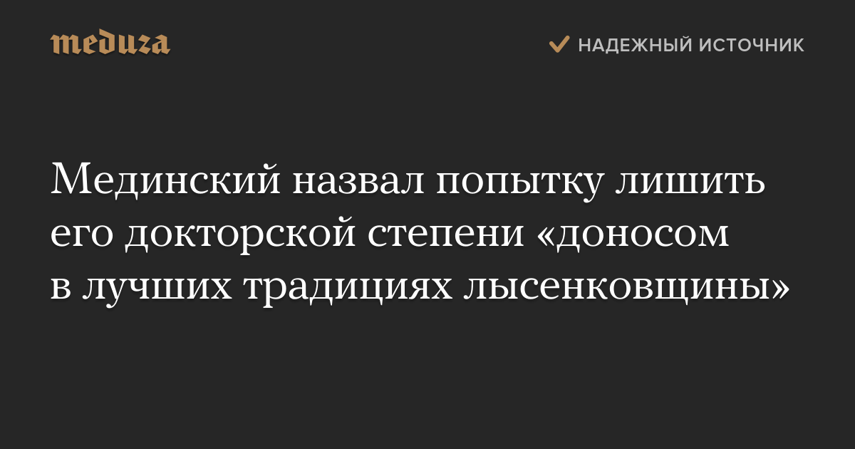 Мединский назвал попытку лишить его докторской степени «доносом в лучших традициях лысенковщины»