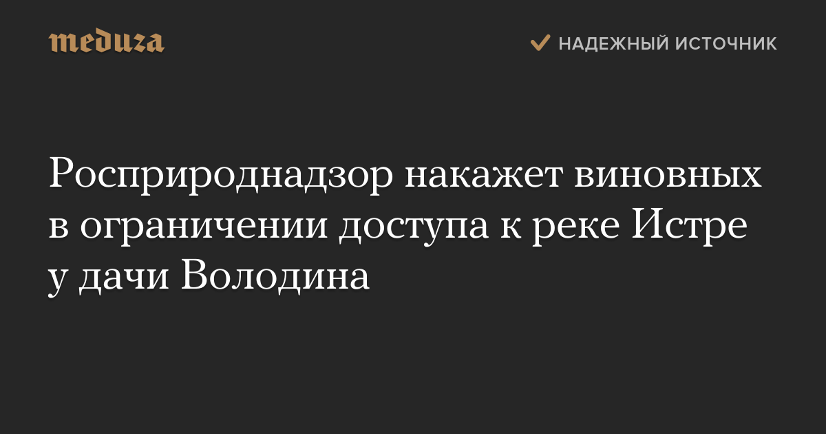 Росприроднадзор привлечет к административной ответственности виновных в ограничении доступа граждан к подмосковной реке Истре, участок которой оказался оформлен в собственность дачного кооператива «Сосны» (одним из учредителей кооператива, по данным Фонда борьбы с коррупцией, является спикер Госдумы Вячеслав Володин). Об этом говорится в ответе ведомства на обращение юристов ФБК.