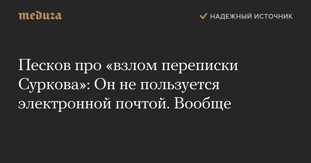 Пресс-секретарь президента РФ Дмитрий Песков опроверг сообщения о взломе переписки Владислава Суркова украинскими хакерами. «Он не пользуется электронной почтой. Вообще», — сказал Песков.