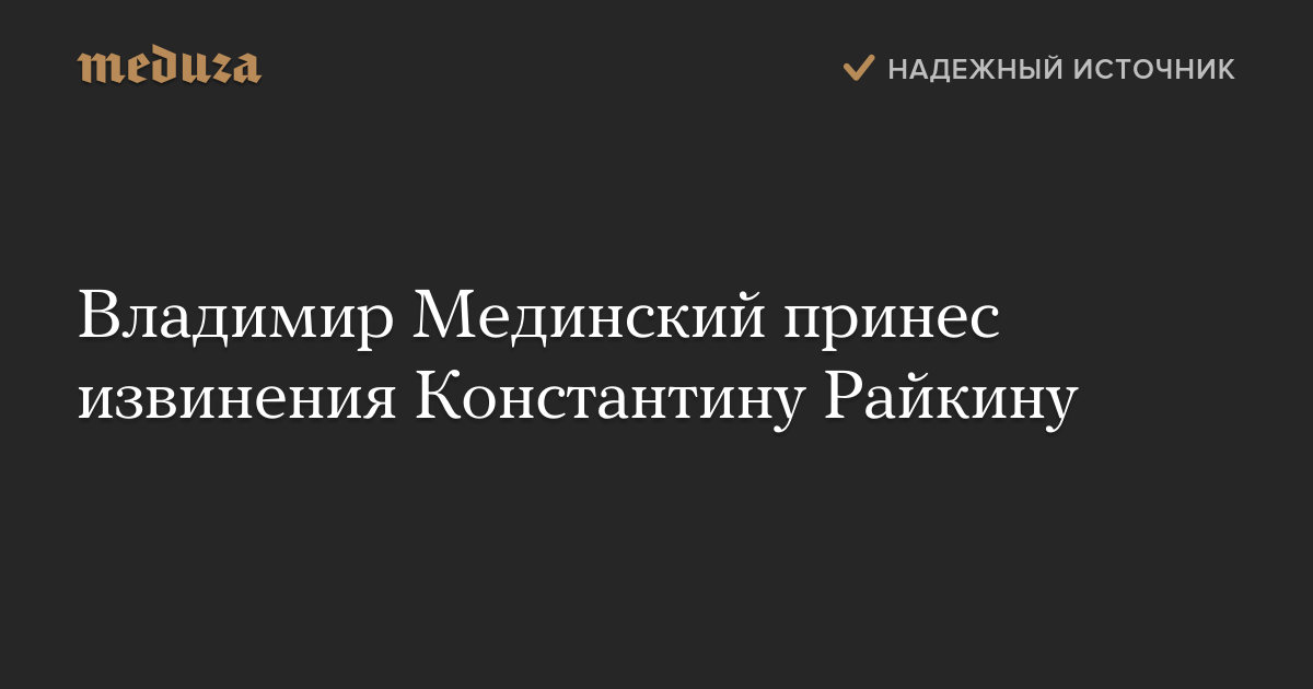 Министр культуры России Владимир Мединский в телефонном разговоре с художественным руководителем театра «Сатирикон» Константином Райкиным принес ему извинения за слова, тон и оскорбительные высказывания заммининистра Владимира Аристархова. Об этом сообщается на сайте «Сатирикона».