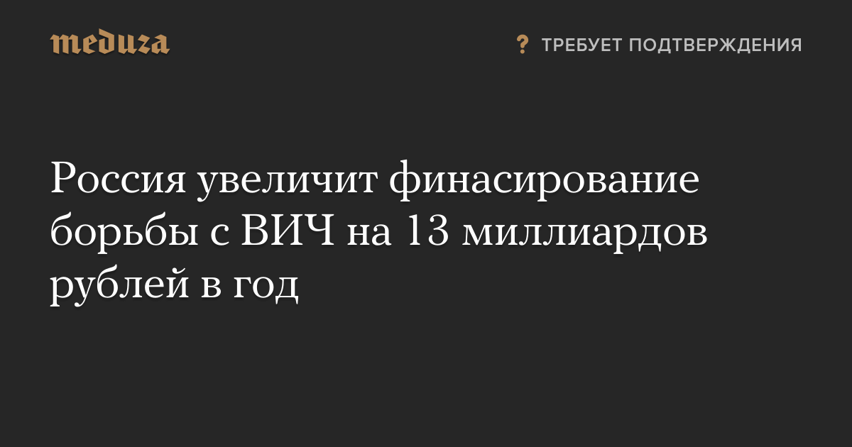 Согласно документу, до 2020 года на борьбу с ВИЧ планируется направить дополнительно 52,9 миллиарда рублей, то есть примерно 13,2 миллиарда в год, пишет издание. В проекте трехлетнего бюджета на 2017-2019 годы на профилактику и лечение ВИЧ и вирусных гепатитов B и C отводится ежегодно более 17 миллиардов рублей.