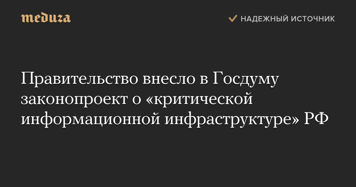 Правительство РФ внесло в Госдуму пакет законопроектов о «критической информационной инфраструктуре» РФ. Документы предусматривают, в частности, создание реестра значимых объектов этой инфраструктуры и введение уголовной ответственности за кибератаки на них.