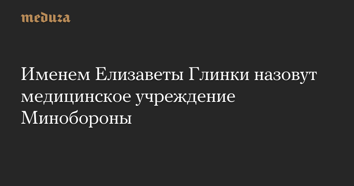Имя руководителя «Справедливой помощи» Елизаветы Глинки будет присвоено одному из медицинских учреждений Минобороны. Об этом сообщил первый заместитель министра обороны Руслан Цаликов. Какое именно учреждение будет носить имя Глинки, он не уточнил.