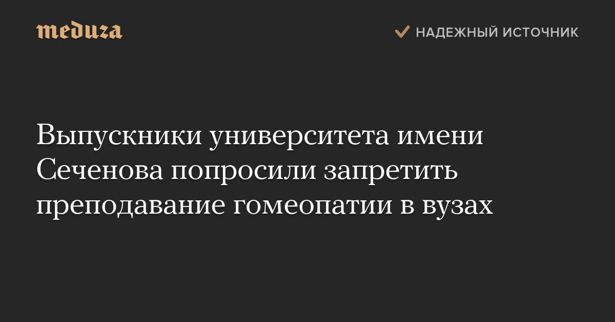 Выпускники Первого Московского государственного медицинского университета имени Сеченова попросили министра здравоохранения России Веронику Скворцову запретить преподавание гомеопатии в медицинских вузах. Соответствующая петиция опубликована на сайте Change.org.