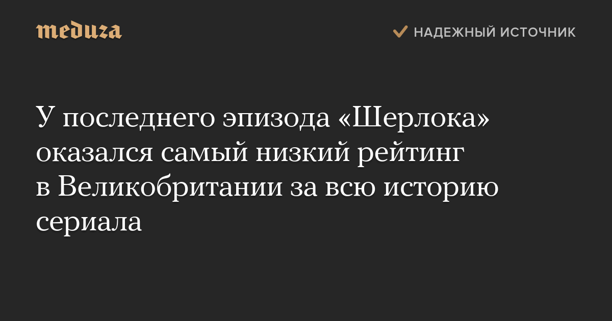 Телевизионный рейтинг последнего эпизода четвертого сезона «Шерлока» («Последнее дело») в Великобритании стал самым низким за историю сериала, сообщает «Би-би-си».