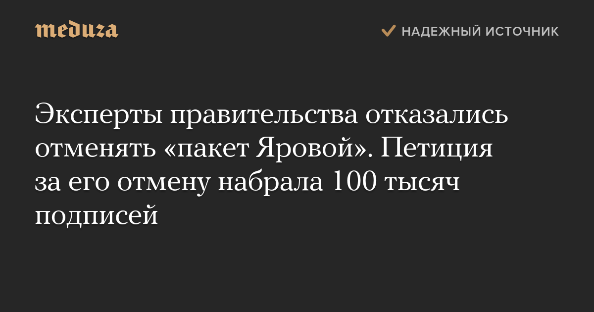 Петиция об отмене «пакета Яровой» появилась на сайте «Российская общественная инициатива» 8 июля. К 14 августа она собрала более 100 тысяч голосов, которые необходимы для рассмотрения петиции в правительстве.