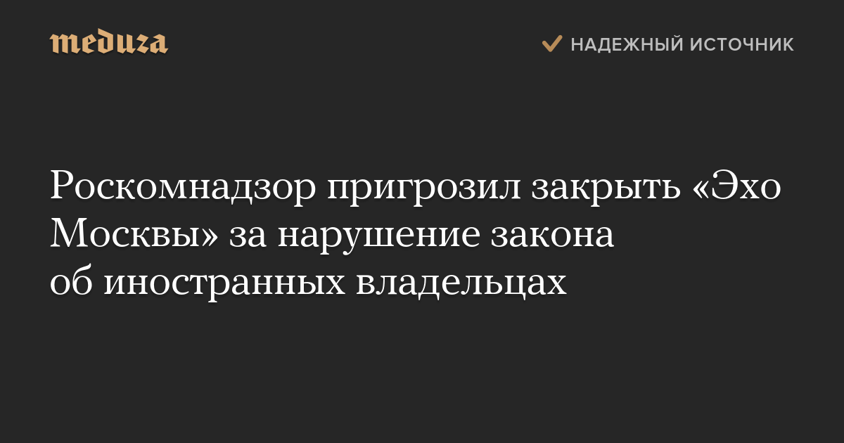 Роскомнадзор направил радиостанции «Эхо Москвы» письмо с требованием устранить нарушения закона, который запрещает иностранцам выступать учредителями российских СМИ. Получение письма подтвердил агентству RNS главред радиостанции Алексей Венедиктов.