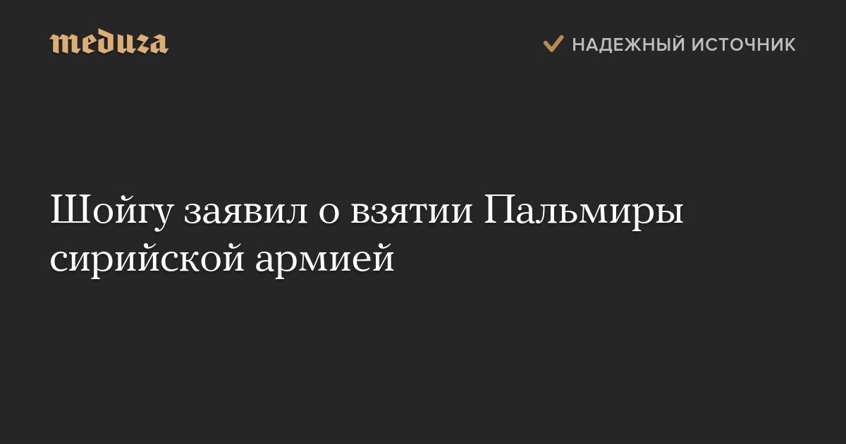 Министр обороны РФ Сергей Шойгу заявил, что сирийские правительственные войска при поддержке российской авиации взяли Пальмиру. Как сообщил пресс-секретарь президента РФ Дмитрий Песков, об этом Шойгу доложил Владимиру Путину. Пальмира находилась под контролем боевиков террористической организации «Исламское государство».