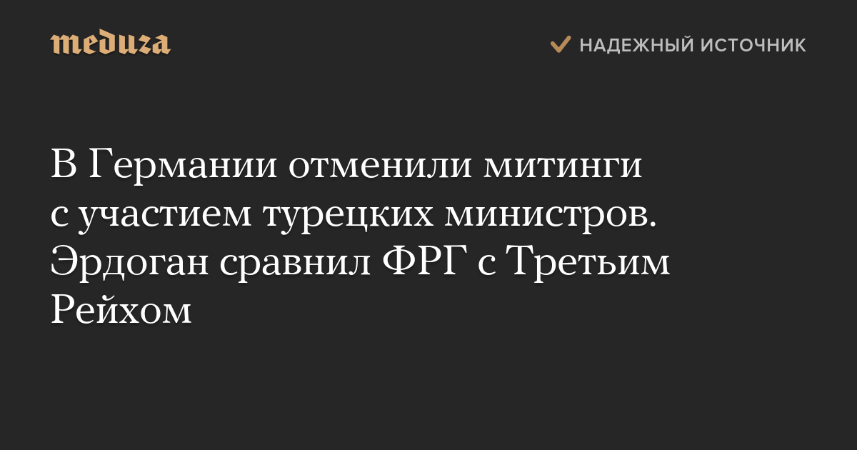Президент Турции Реджеп Тайип Эрдоган, комментируя отмену в Германии массовых акций с участием министров турецкого правительства, заявил, что действия властей Германии «не отличаются от действий времен нацистов».