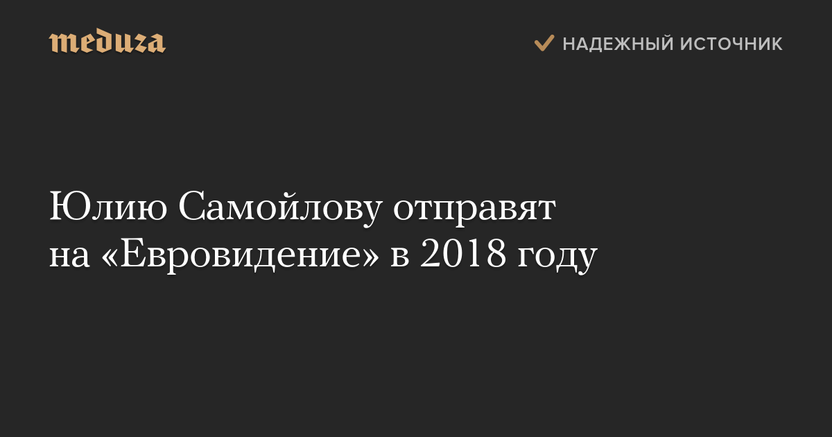 Певица Юлия Самойлова, которой Служба безопасности Украины запретила въезд в страну для участия в «Евровидении-2017» в Киеве, будет представлять Россию на следующем конкурсе в 2018 году. Об этом «Медузе» сообщили в пресс-службе Первого канала.