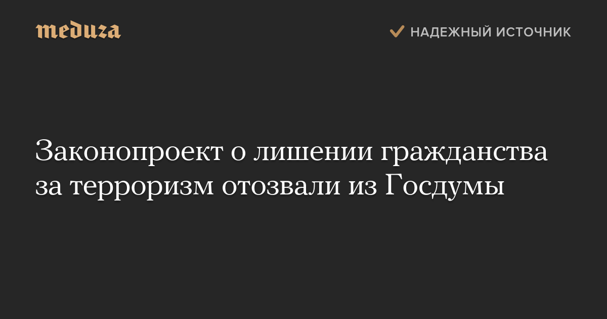 Законопроект, предлагающий лишать гражданства РФ осужденных за терроризм, отозван из Госдумы. Об этом сообщает «Би-би-си».