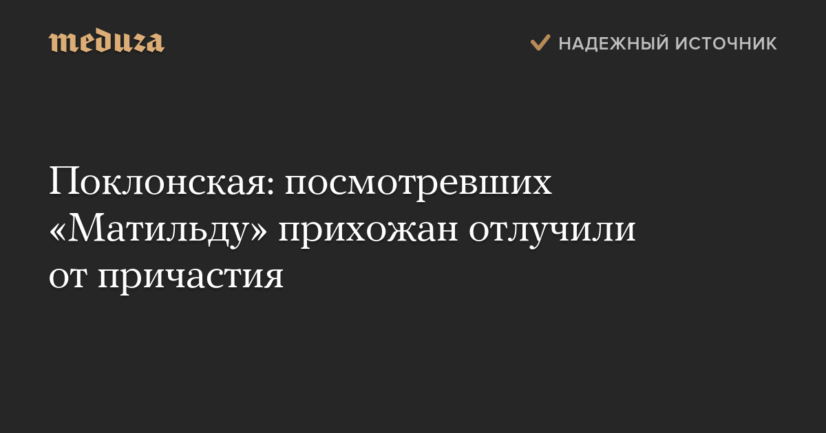 Исправление: В первоначальной версии заметки РБК шла речь об отлучении от причастия посмотревших «Матильду» священников, а не прихожан. РБК исправило заметку и принесло свои извинения. «Медуза» также приносит читателям извинения.