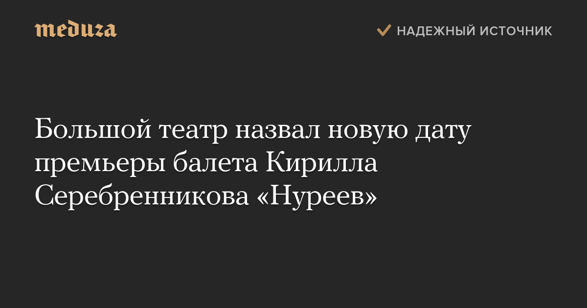 Премьера балета Кирилла Серебренникова «Нуреев» перенесена на 4-5 мая 2018 года. Об этом, сообщает корреспондент «Медузы», объявил на специальной пресс-конференции директор Большого театра Владимир Урин. Спектакль будет показан на Исторической сцене, добавил он.