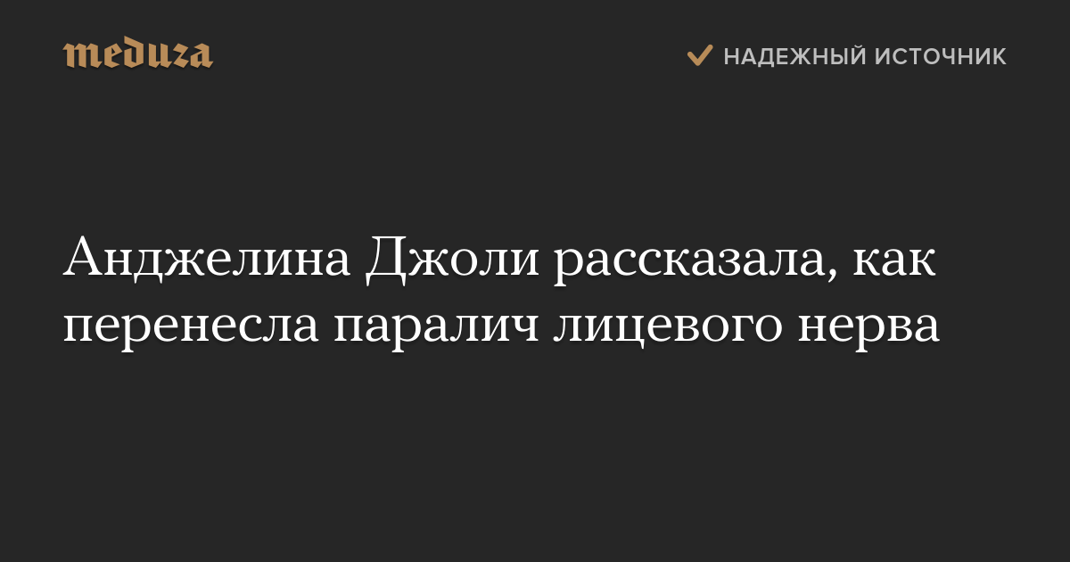 Анджелина Джоли рассказала журналу Vanity Fair, что в 2016 году у нее диагностировали паралич Белла — это форма паралича лицевого нерва, при котором нарушаются функции мимических мышц на одной стороне лица. По словам актрисы, она справилась с этим заболеванием с помощью иглоукалывания.