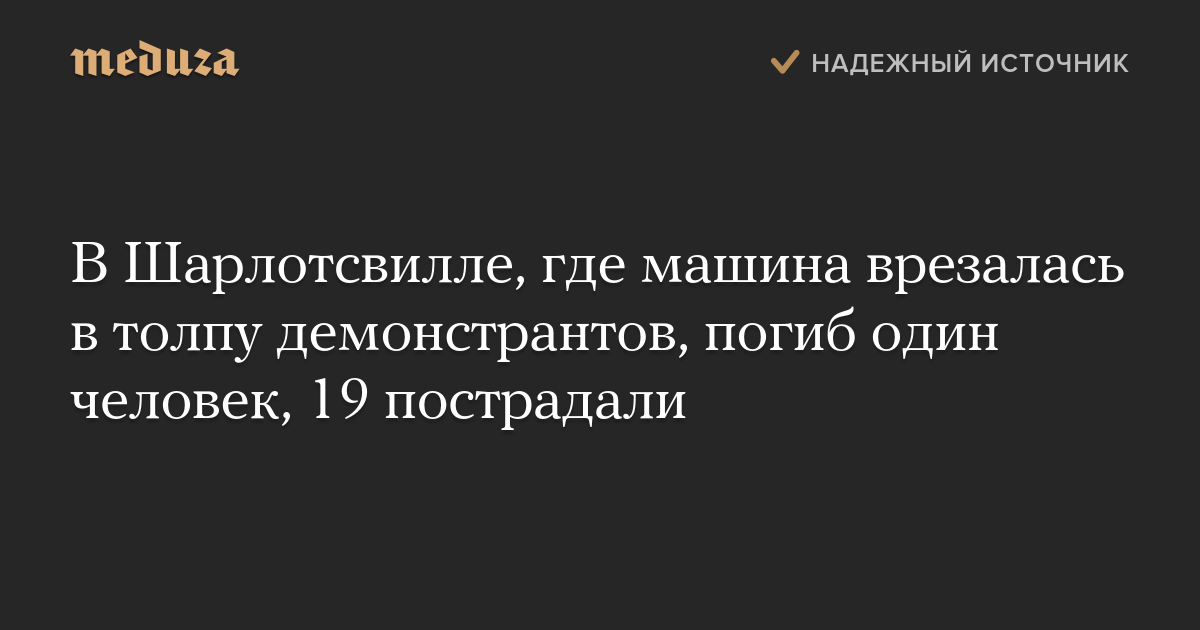 В Шарлотсвилле, где машина врезалась в толпу демонстрантов, погиб один человек, 19 пострадали