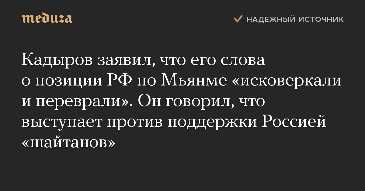 Кадыров заявил, что его слова о позиции РФ по Мьянме «исковеркали и переврали». Он говорил, что выступает против поддержки Россией «шайтанов»
