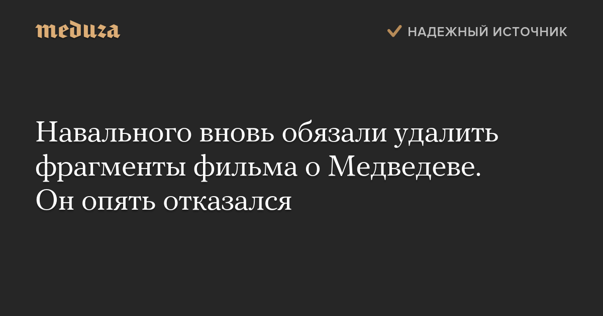 Навального вновь обязали удалить фрагменты фильма о Медведеве. Он опять отказался