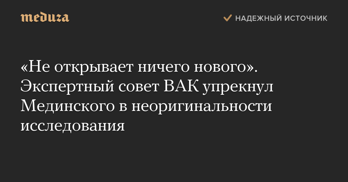Экспертный совет Высшей аттестационной комиссии (ВАК) раскритиковал диссертацию министра культуры Владимира Мединского за необъективный анализ источников и неоригинальность темы исследования. Об этом со ссылкой на текст заключения совета пишет «Коммерсант».