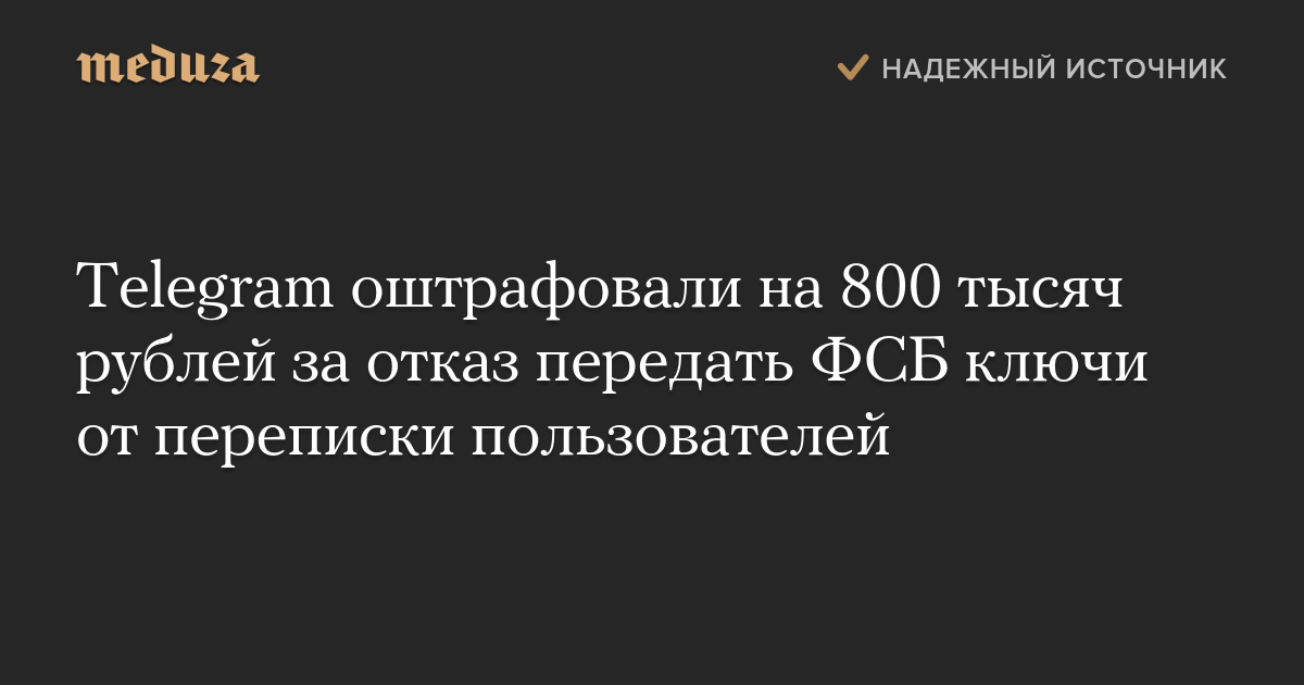Telegram оштрафовали на 800 тысяч рублей за отказ передать ФСБ ключи от переписки пользователей